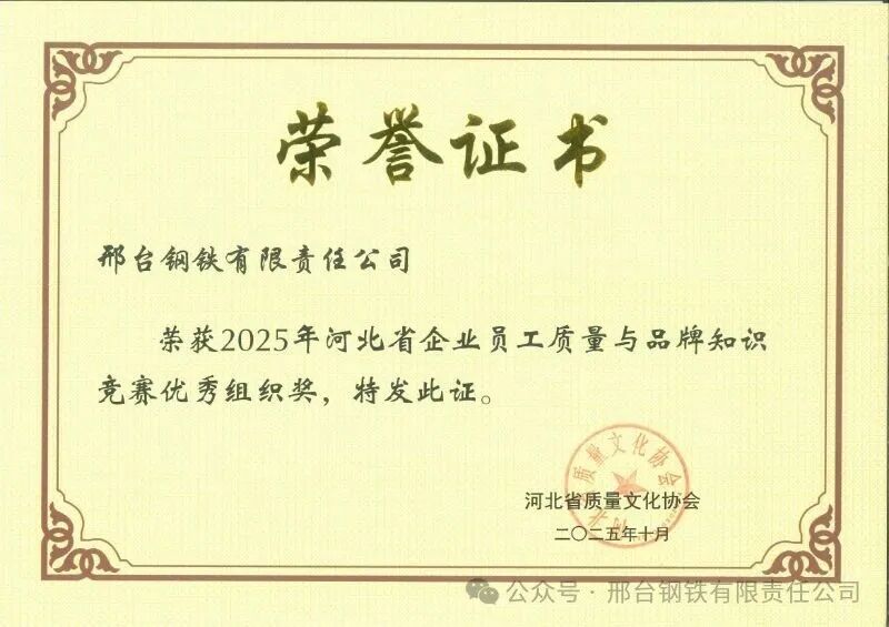 近日,2025年河北省企業(yè)員工質(zhì)量與品牌知識(shí)競賽結(jié)果揭曉,邢臺(tái)鋼鐵有限責(zé)任公司憑借出色的組織工作和員工優(yōu)異的答題表現(xiàn),榮獲“優(yōu)秀組織獎(jiǎng)”,6名員工分獲個(gè)人一、二、三等獎(jiǎng)。
